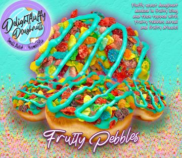 Fluffy yeast doughnut dunked in fruity icing and then topped with Fruity Pebbles cereal and fruity drizzle!