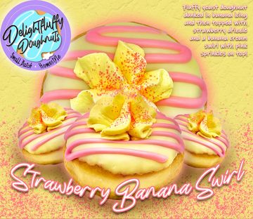 Fluffy yeast doughnut dunked in banana icing and then topped with strawberry drizzle and a banana cream swirl with pink sprinkles on top!