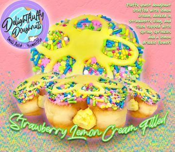 Fluffy yeast doughnut stuffed with lemon cream, dunked in strawberry icing, and then topped with spring sprinkles and a lemon drizzle flower!