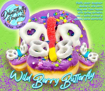 Fluffy yeast doughnut dunked in wild berry icing and then topped with spring sprinkles and a white pretzel & sour gummy worm butterfly!
